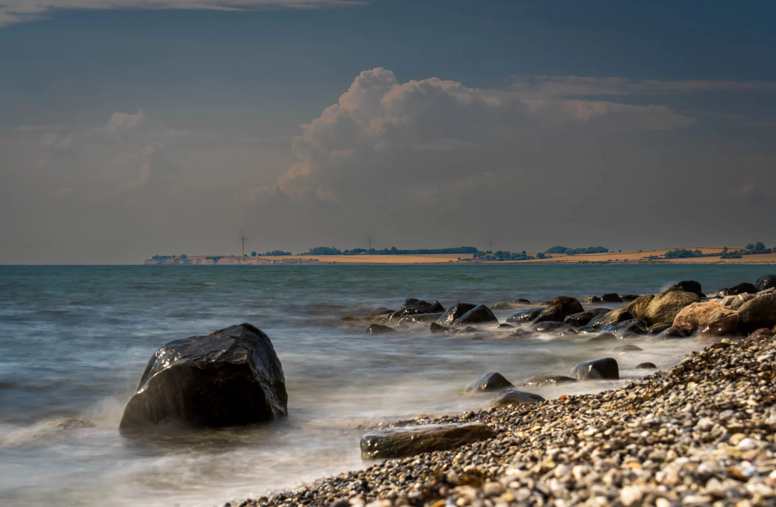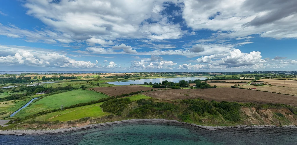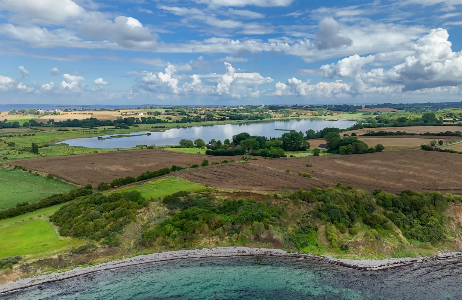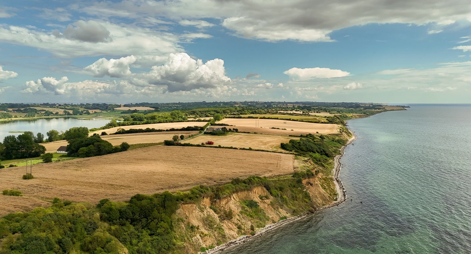 På Jørbæk Strand møder de hvide kystskrænter det åbne hav i en dramatisk og harmonisk bevægelse – et landskab formet af naturens egne kræfter.